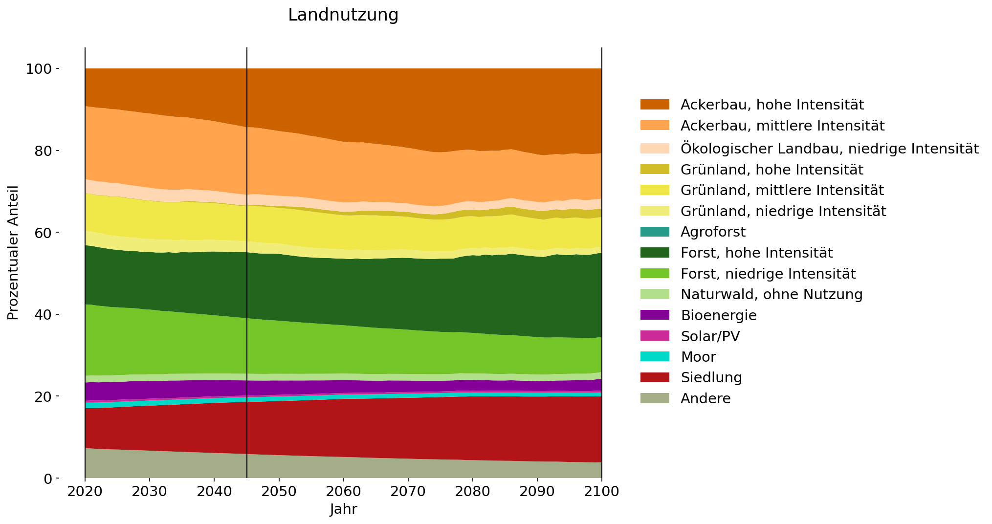 Bis 2045 zeigt sich eine deutliche und kontinuierliche Zunahme der landbasierten Senkenleistung. Dennoch ist der Landsektor allein nicht in der Lage, die 62 Millionen Tonnen CO₂-Bindung zu erreichen, die erforderlich sind, um das Neutralitätsziel von 5 % Restemissionen in diesem Jahr zu erreichen. Die Steigerung der Senkenleistung in diesem Szenario ist auf eine starke Zunahme des Schutzwaldes zurückzuführen. Dies resultiert einerseits aus der Aufforstung von Ackerflächen und andererseits aus der Veränderung der Waldbewirtschaftung, insbesondere von zuvor intensiv gemanagten Forstflächen. Auch extensiv bewirtschaftete Forstflächen nehmen zugunsten von intensiven Forst- und Landwirtschaftsflächen zu. Die insbesondere in der stofflichen Nutzung steigende Nachfrage nach Holz (u.a. im Bausektor), kann durch das bestehende Angebot gedeckt werden. Als Resultat dieser Landnutzungsänderungen nimmt die Biodiversität, wenngleich nur geringfügig, zu. Aufgrund zunehmender Ernährungsumstellungen, die den Rückgang des Fleischkonsums weiter verstärken, orientieren sich landwirtschaftliche Praktiken zunehmend auch an ökologischen Aspekten. So kann der Nahrungsmittelbedarf weiterhin gedeckt werden. Diese Veränderung im Einklang mit steigendem gesellschaftlichem Umweltbewusstsein zeigt sich anhand der konstanten Fläche für extensiven Ackerbau, während die intensive Landwirtschaft stark rückläufig ist. Weiterhin wird dies durch die fortschreitende Multifunktionalität der Landnutzung, wie die Zunahme von Agroforst-Flächen zeigt, bestärkt. Insbesondere in Städten nimmt die multifunktionale Flächennutzung durch integrierte Konzepte (Vertical Farming, nachhaltige Stadtentwicklungskonzepte) zu, wodurch die Siedlungsfläche trotz leichtem Bevölkerungswachstum nur minimal steigt. Trotz eines leicht rückläufigen Trends bleibt die Fläche für Bioenergie auf einem vergleichsweise hohen Niveau. Im Gegensatz dazu setzt sich der Trend des stagnierenden Ausbaus der Solarenergie aufgrund der hohen Flächenkonkurrenz zur landbasierten CO₂-Entnahme trotz der kontinuierlich steigenden Nachfrage fort.